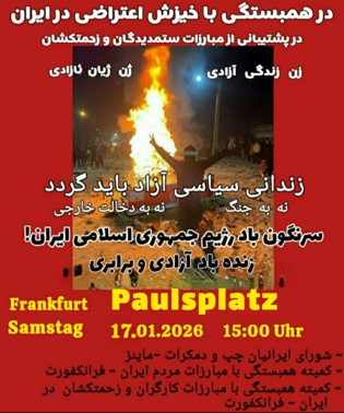 ما نهادها و کلکتیوهای چپ، دمکرات، فمینیست و کوئیر امضا کنندهی این فراخوان، بمناسبت روز جهانی "مبارزه با خشونت علیه زنان" در روز سه شنبه ٢۵ نوامبر و شنبه ٢۹ نوامبر ۲۰۲۵، در شهرهای آمستردام، استراسبورگ، برلین، فرانکفورت، کاسل، کلن، لندن، ونیز، وین، هامبورگ و هانوفر، به خیابان خواهیم آمد تا صدای خود را در اعتراض به خشونت علیه زنان، علیه اعدام این قتل دولتی، به گوش جهانیان برسانیم.