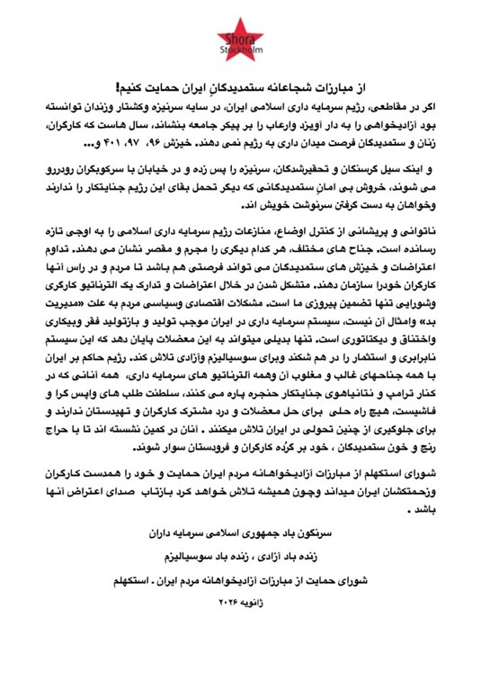 شنبه ۱۷ ژانویه ۲۰۲۶ برابر با ۲۷ دی ۱۴۰۴، شورای استکهلم همراه با دیگر نیروهای آزادیخواه و چپ و کمونیست برگزارکننده تظاهرات بود.