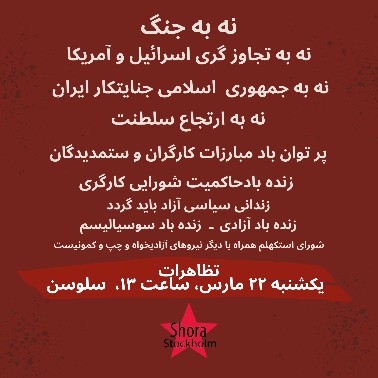 - نه به جنگ، نه به جمهوری اسلامی، آری به مبارزات کارگران و ستمدیدگان برای آزادی و عدالت اجتماعی.